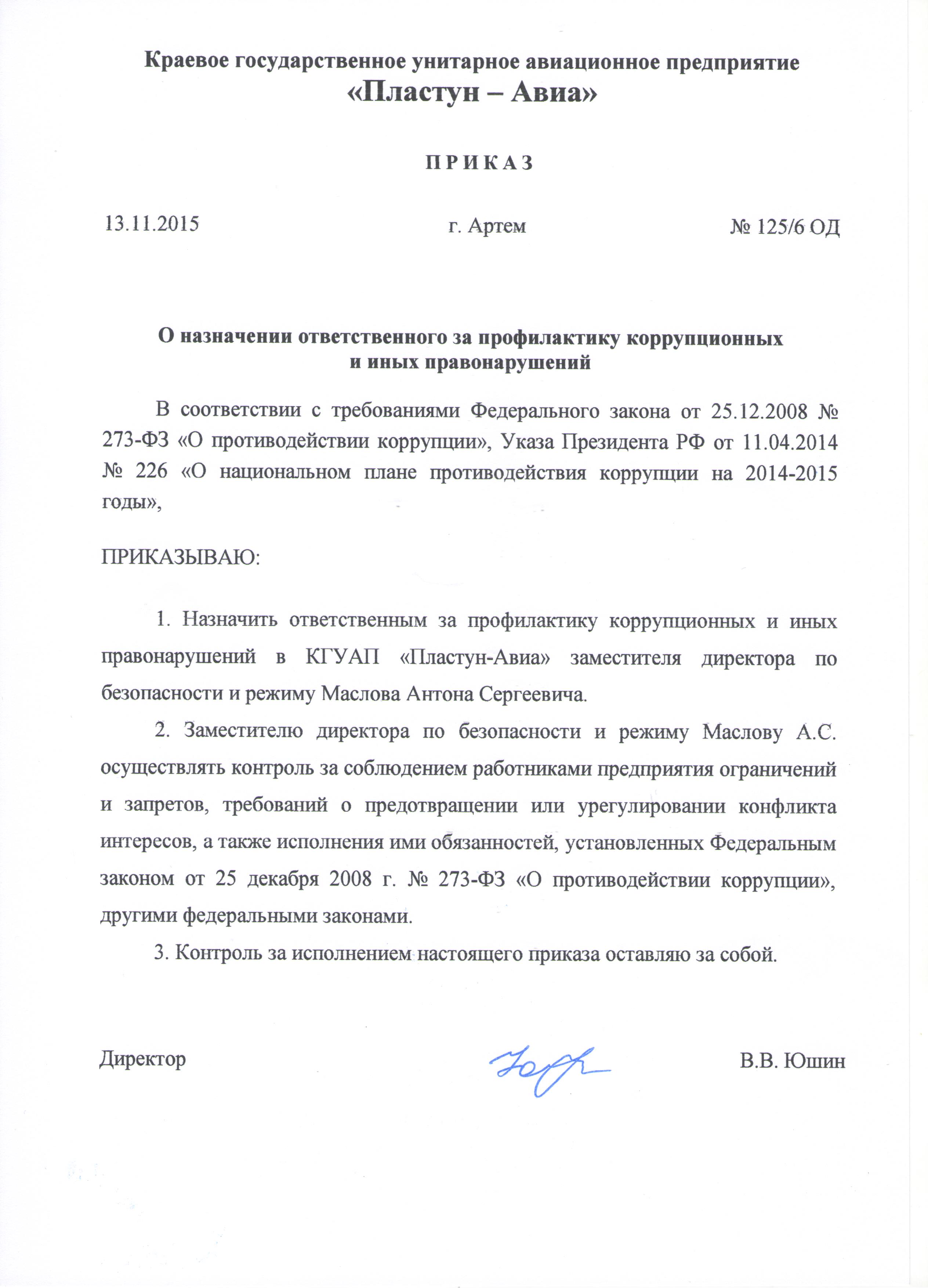 3. Приказ о назначении ответственного за профилактику коррупционных и иных правонарушений.